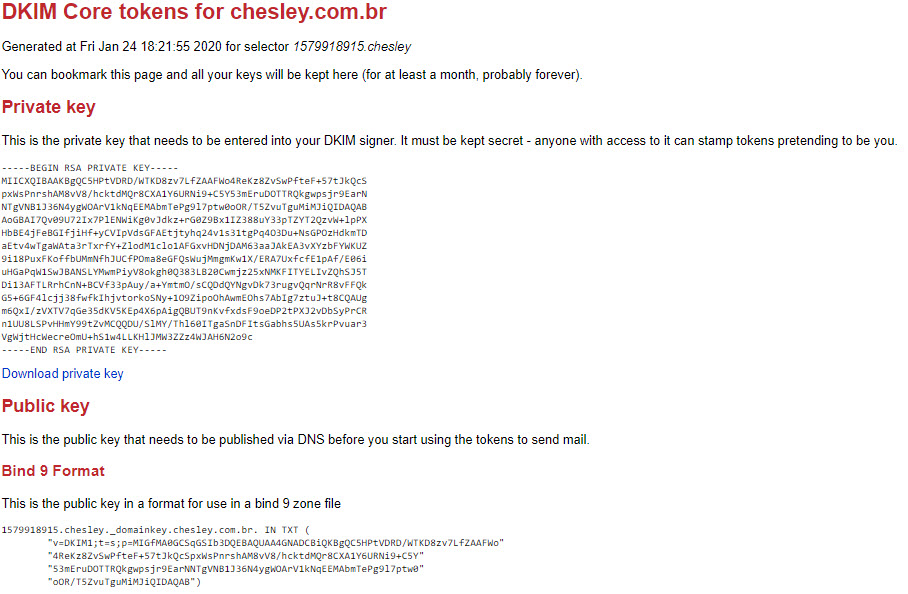 Neste exemplo foi gerado a chave privada e o registro para ser posto no DNS.
