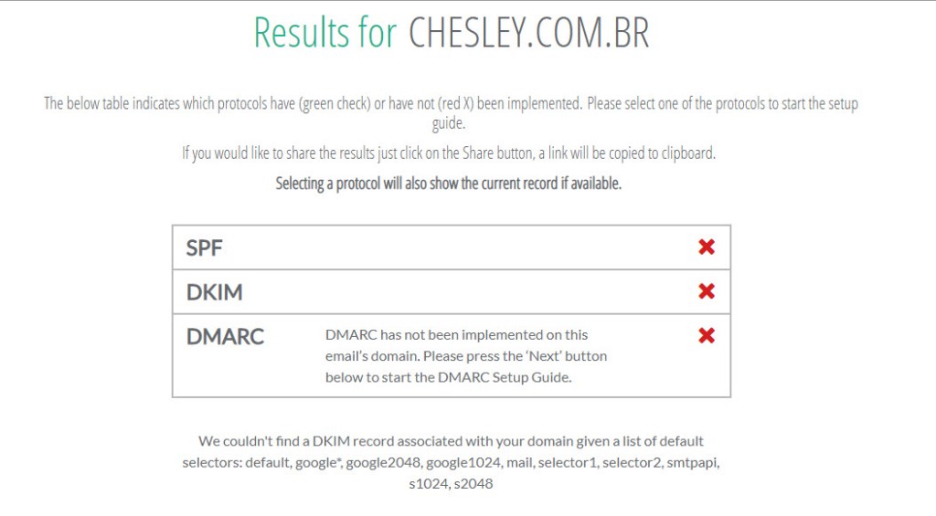 _dmarc.chesley.com.br. IN TXT “v=DMARC1; p=reject; rua=mailto:chesley@chesley.com.br; ruf=mailto:chesley@chesley.com.br; sp=reject; ri=86400”