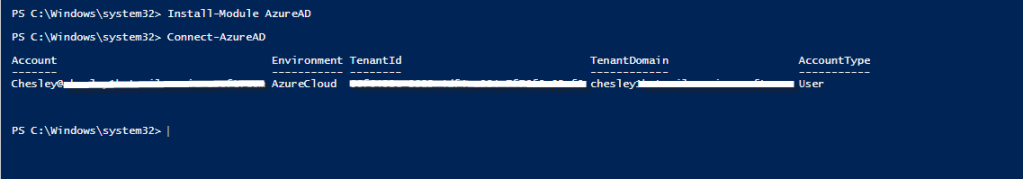 Install-Module AzureAD PS C:\>Connect-AzureAD