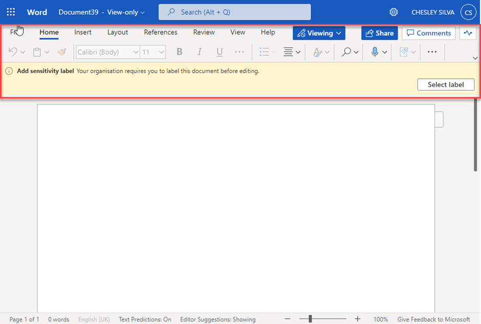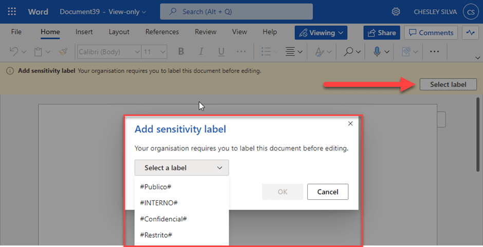 • Proteção e marcação são aplicadas por etiquetas. Alguns rótulos são projetados para servir como indicadores visuais da sensibilidade de um item sem tomar qualquer ação protetora. Outros rótulos imporão ações como marcação e/ou criptografia. A proteção dada por um rótulo deve corresponder à sensibilidade esperada definida pelo seu nome, e os direitos atribuídos no rótulo devem apoiar seu uso dentro da organização (ou fora, se os itens rotulados forem compartilhados com pessoas externas). Lembre-se que uma etiqueta também pode aplicar marca visual aos itens (marcas d’água, cabeçalhos e rodapés), então considere se isso é necessário.