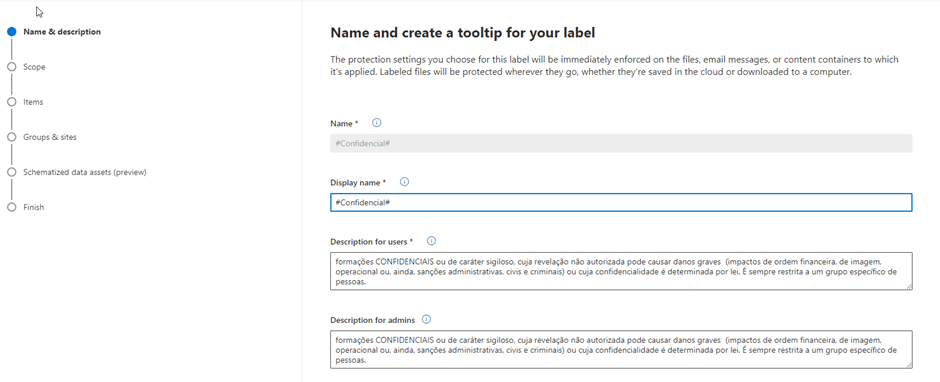 Criar um novo rótulo de sensibilidade passa por seis etapas: