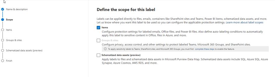 • Etiquetas de escopo. Separe os rótulos em conjuntos usados para a proteção da informação, as etiquetas de escopo podem ser aplicadas tanto em arquivos, mensagens como também nos sites do sharepoint e no MSTeams, as configurações definidas no rótulo determinam seu escopo, se atente a isso.