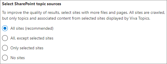 - Na página Escolher como os Tópicos do Viva podem encontrar tópicos , você configurará a descoberta de tópicos. Na seção Selecionar fontes de tópicos do SharePoint , selecione quais sites do SharePoint serão rastreados como fontes para seus tópicos durante a descoberta. Escolha entre: