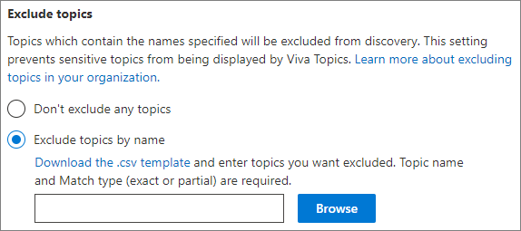 - Na seção Excluir tópicos por nome , você pode adicionar nomes de tópicos que deseja excluir da descoberta de tópicos. Use essa configuração para evitar que informações confidenciais sejam incluídas como tópicos. As opções são:
