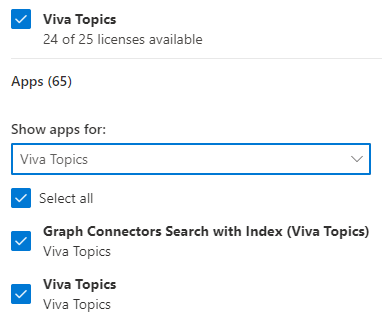 - Em Aplicativos , certifique-se de que Pesquisa de conectores de gráfico com índice (Tópicos do Viva) e Tópicos do Viva estejam selecionados.