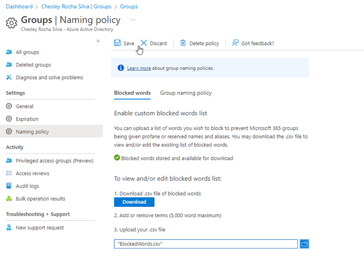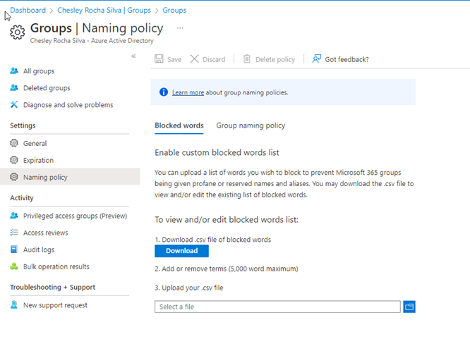 - Na guia Palavras bloqueadas em Grupos | Na página de política de nomenclatura , selecione Baixar para baixar um arquivo de amostra.