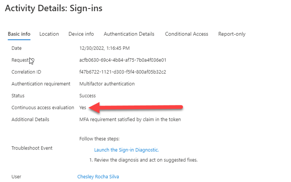 Os administradores podem ver os detalhes das entradas que usam a avaliação de acesso contínuo aplicando um filtro de (Is CAE Token = Yes) no portal de administração do Azure AD . A Figura abaixo mostra os detalhes de uma sessão habilitada para CAE.