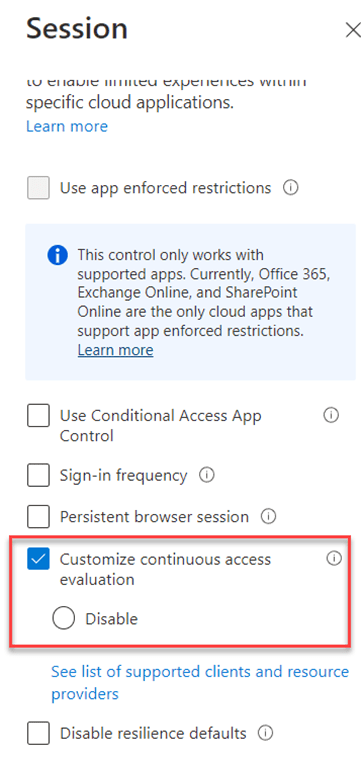 “Desativar” funciona corretamente quando “Todos os aplicativos de nuvem” é selecionado e nenhuma condição foi escolhida. Portanto, se você deseja desabilitar a avaliação de acesso contínuo, deve criar explicitamente uma política de acesso condicional direcionada a todos os aplicativos de nuvem, sem nenhuma condição, para que você possa desativá-la apenas para cada sessão que passa pelo acesso condicional do Azure AD.