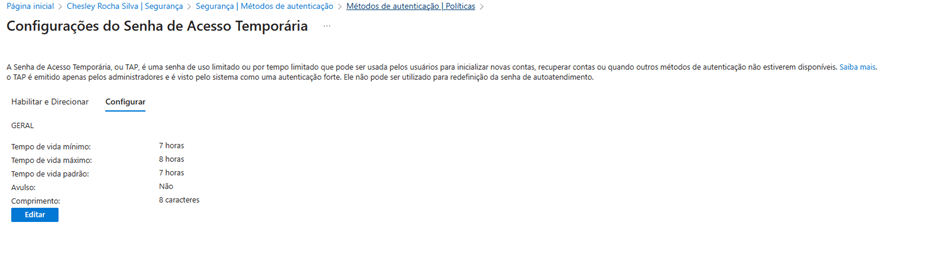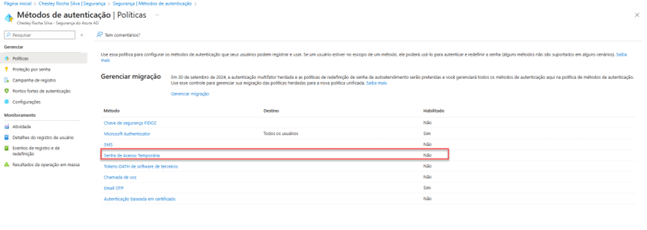 - Na lista de métodos de autenticação disponíveis, selecione Passe de Acesso Temporário.