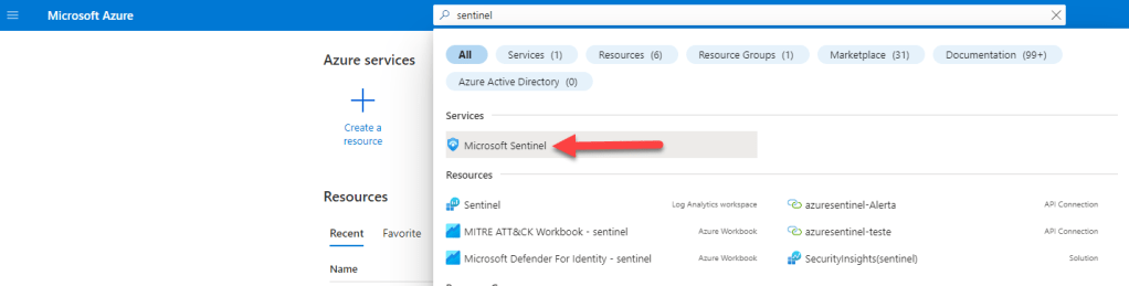 - Na barra de pesquisa superior, digite Sentinel e clique em Microsoft Sentinel .