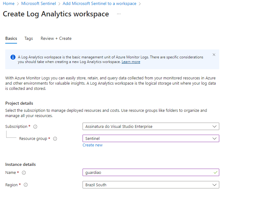 Escolha da Assinatura: Opte pela assinatura do Azure na qual deseja implementar o ambiente do Microsoft Sentinel.