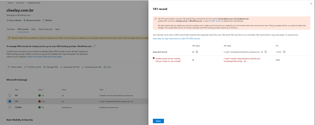 Percebam que meu registro tem um erro proposital, o que vou fazer é copiar o registro correto e adicionar no meu DNS Externo. A mensagem mostra Entrada inválida porque não temos a instrução include:spf.protection.outlook.com em nosso registro SPF. Queremos mesclar o registro SPF do Exchange Online no registro SPF de domínio exoip.com existente. É por isso que copiaremos apenas a instrução include, include:spf.protection.outlook.com, para a área de transferência.