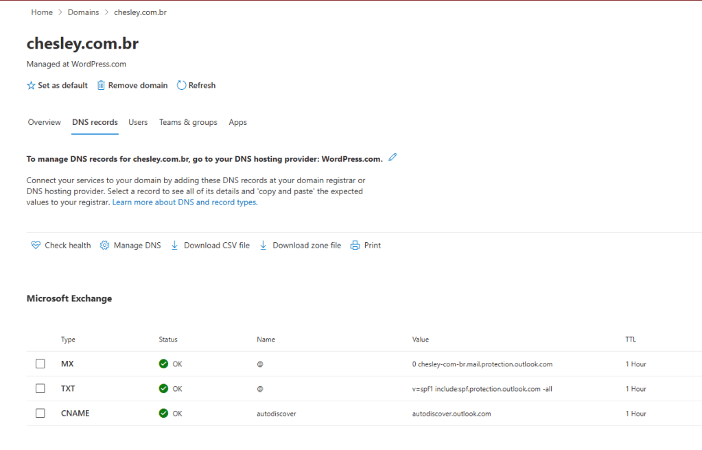 O que nos interessa por enquanto é o registro TXT, que é o registro SPF do Exchange Online.