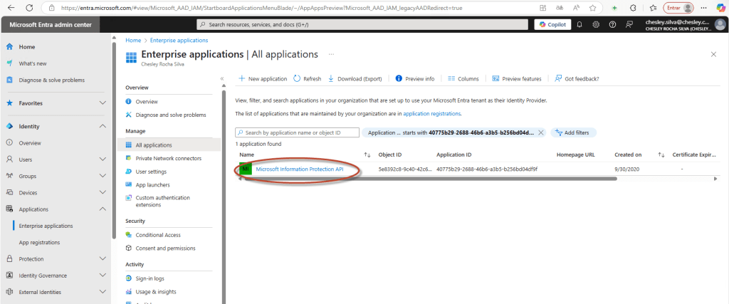 Selecione o aplicativo API de Proteção de Informações da Microsoft