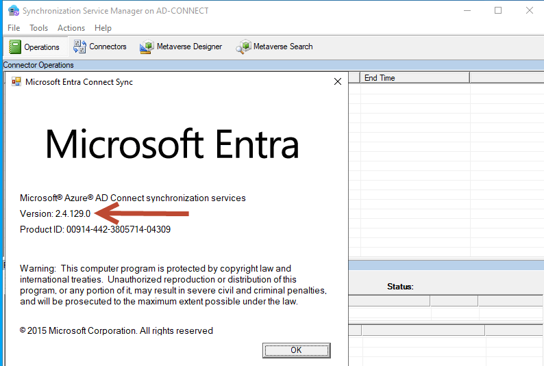 Execute o AzureADConnect.exe e vá até About. Confirme se está utilizando uma versão 2.1.20.0 ou superior.