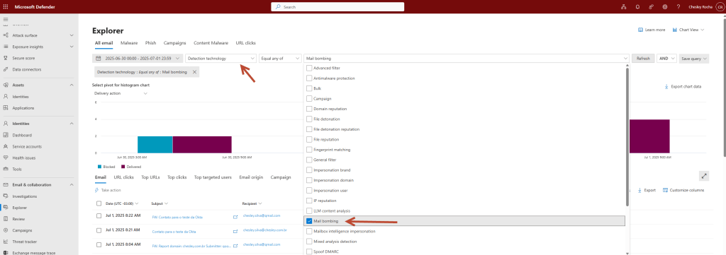 1. Investigação e busca: Os Analistas de SOC podem agora pesquisar por emails bombas e assim ter uma visão ampla do que esta acontecendo na o organização.