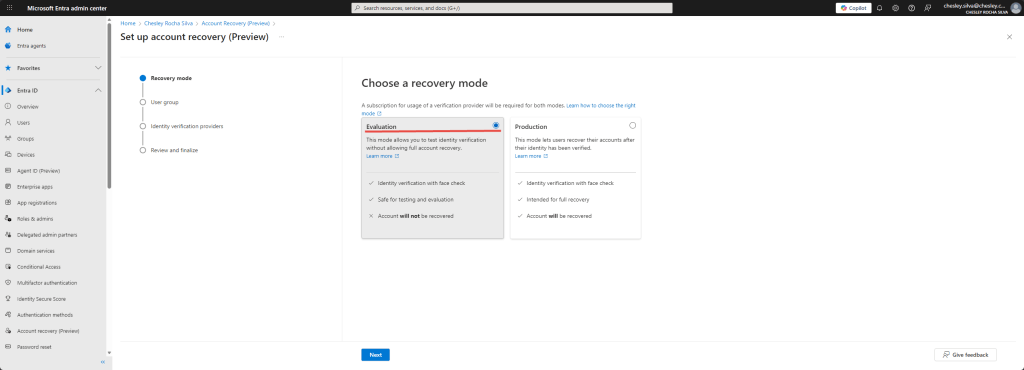 - Na atualização da configuração de recuperação de conta (versão preliminar), selecione Avançar.