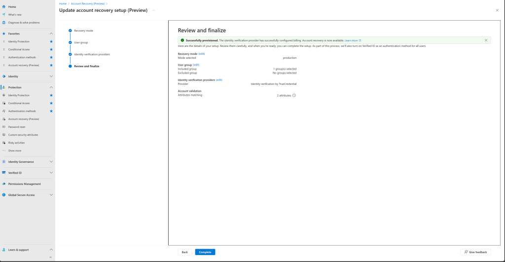 - Depois de ver Success, retorne ao processo de configuração da Recuperação de Conta no Centro de administração do Microsoft Entra para concluir as etapas restantes.