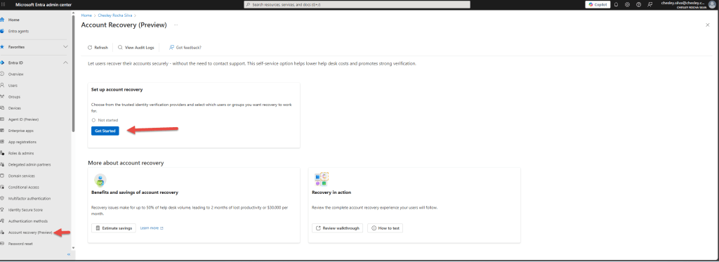 - Combine com outros controles de segurança — mesmo com recuperação habilitada, mantenha práticas fortes de MFA, registro de autenticação, auditoria e governança de identidade. A recuperação não substitui essas proteções.