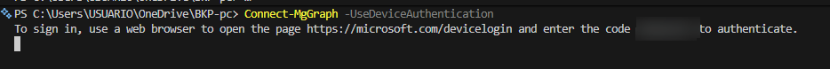 No entanto, sua disponibilidade depende da configuração do seu locatário. Muitos tenants do Microsoft 365 bloqueiam o login do código do dispositivo por meio de políticas de Acesso Condicional para manter uma base de segurança forte. Se a autenticação por código de dispositivo for permitida no seu tenant, você pode se conectar ao Microsoft Graph usando o seguinte cmdlet.