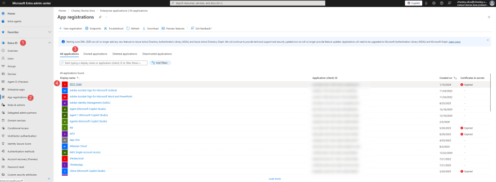 - Clique em Entra ID > Inscrições de aplicativos > Todas as inscrições.
